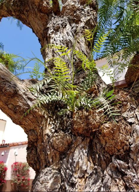 Tiene tronco nudoso o robusto y una corteza rugosa, fisurada/áspera, de tonos pardos a grises, que puede exfoliarse o verse escamosa con la edad.
